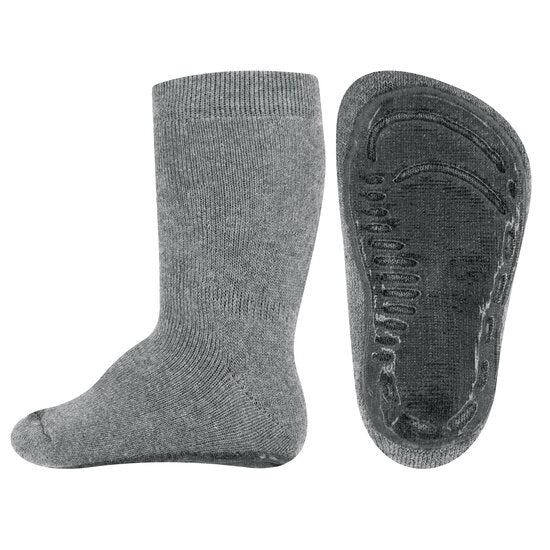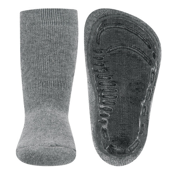 Heerlijke warme huissokken met een anti-slip zool van Ewers. Deze antislip sok effen grijs is gemaakt van van 80% katoen, 17% polyamide en 3% elastan. Hierdoor blijft de sok goed zitten en heeft uw kindje heerlijke warme voetjes en meer grip bij het kruipen lopen en staan.