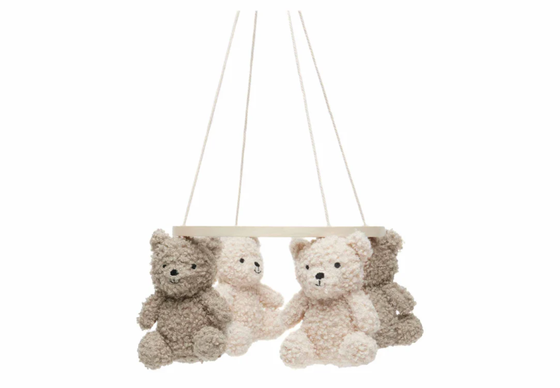 Deze baby mobiel met teddy beertjes is geweldig voor jouw kleintje! Je kunt de mobiel aan de rand van de box bevestigen voor veel speelplezier of aan de rand van het ledikantje voor het slaapritueel. De beertjes hebben de kleuren Natural en Olive Green of Natural en Wild Rose. Deze mobiel maakt echt een geweldig (kraam)cadeautje!