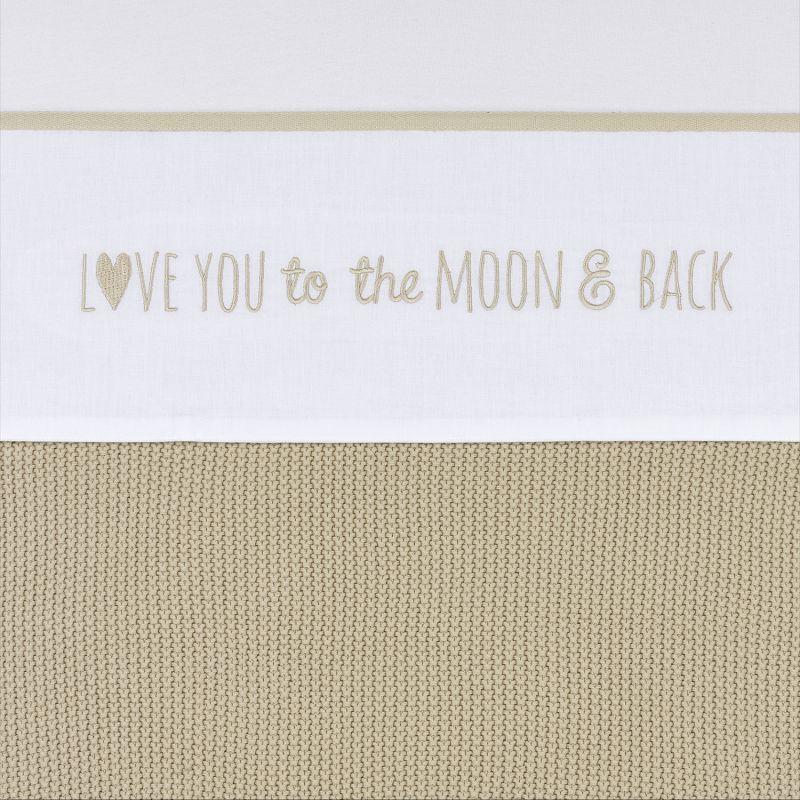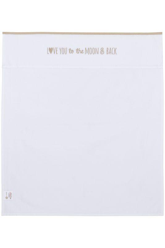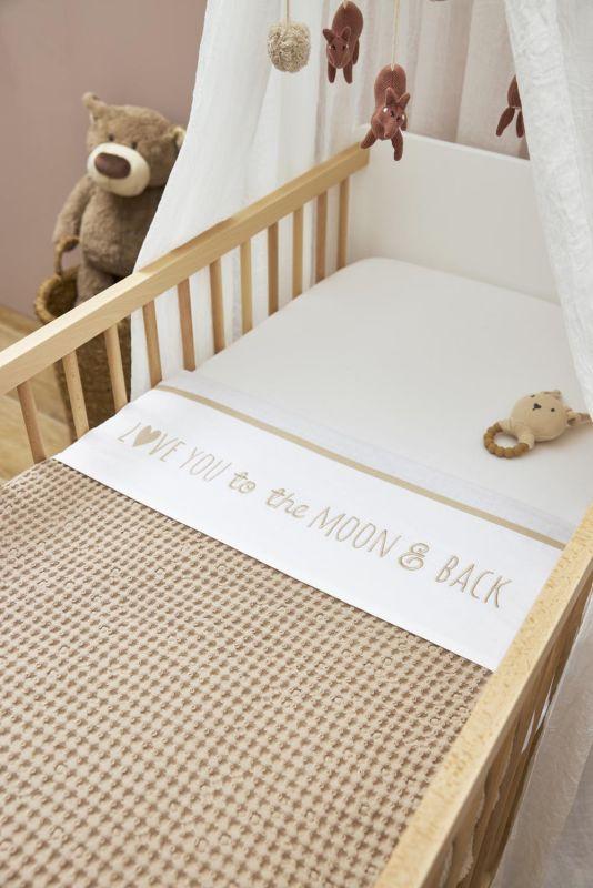 Een heerlijk zacht lakentje van 100% katoen. Door het gebruik van 100% katoen is het lakentje goed ademend en veilig maar vooral comfortabel om onder te slapen. Het witte laken is voorzien van een gekleurde bies en geborduurde tekst ‘Love you to the moon & back’.