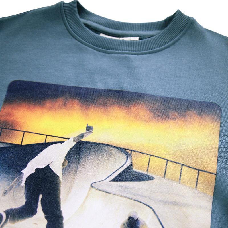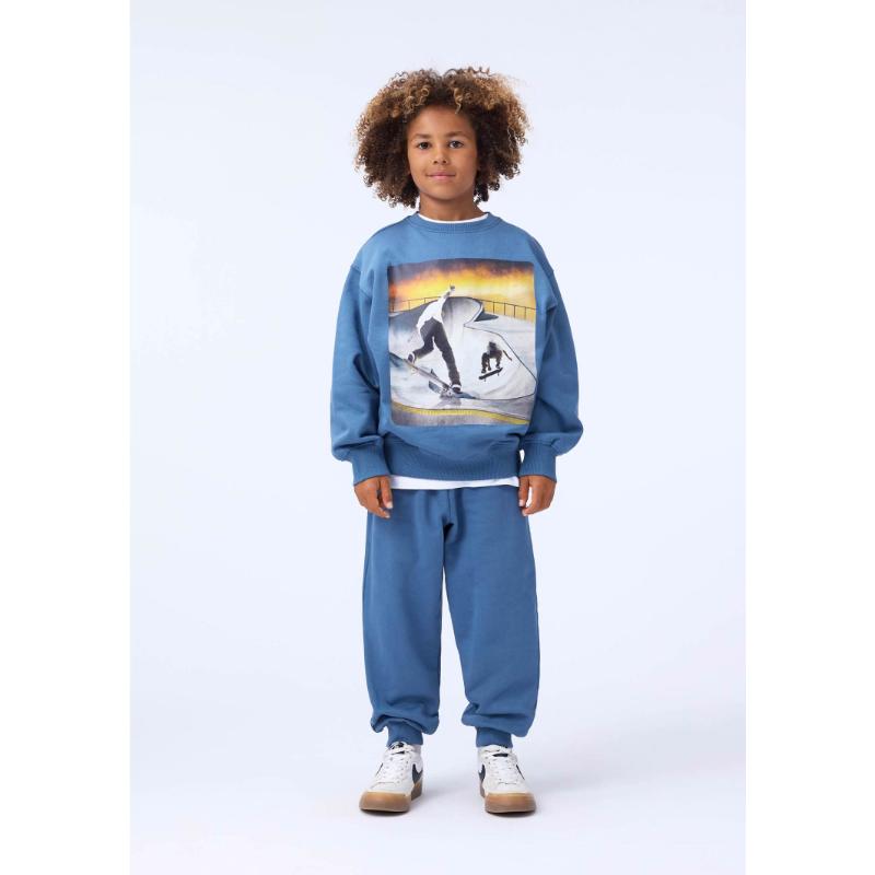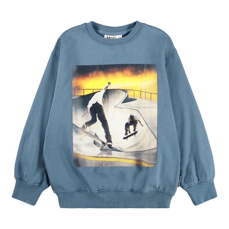 Molo Sweater Monti Flaming Blue. Molo heeft de fijnste sweaters! Dit seizoen met een toffe skate print.