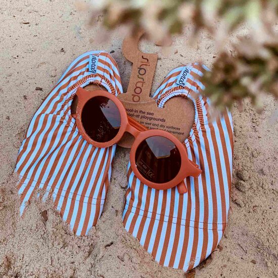Slipstop cognac wit gestreepte waterschoentjes zijn praktisch voor baby en kind met multifunctionele gebruiksmomenten. Je kan de Slipstops gebruiken op zowel natte als droge ondergronden. Zowel binnen als buiten zijn de Slipstop shoes een goede keuze. Je kleintje heeft grip tijdens het rennen en spelen en door de zool is het voetje beschermd tegen prikken en hete tegels, zand en kunstgras.