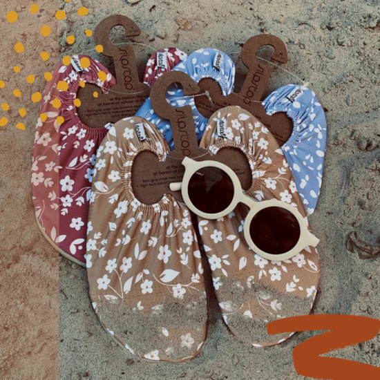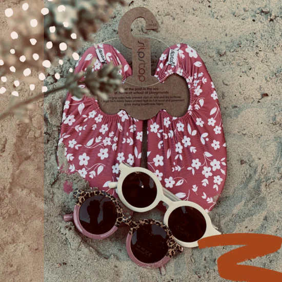 Roest bruin/rood kleurige zwemschoentjes met een wit schattig bloemen printje! Deze hippe kleur slipstopsshoes kunnen goed onder de zwem outfitjes van dit seizoen.